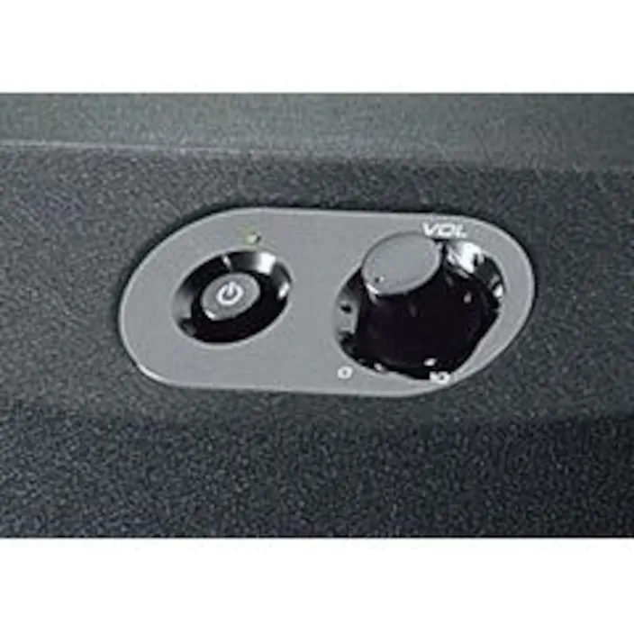 Die “Power”-Taste sowie die Lautstärkenregelung finden Sie an der Vorderseite des Subwoofers. Das Bedienfeld ist leicht, zu 45°, geneigt, sodass die Tasten leicht zu bedienen sind. Dank des LED Lichts ist leicht erkennbar, ob der Subwoofer ein- oder ausgeschaltet ist.